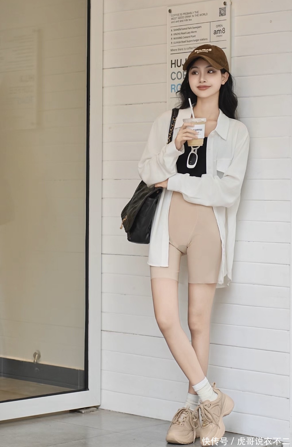 骑行短裤还可以搭配男友风衬衫+背心来穿,既能遮肉显瘦,又能凸显高腰线,从而让身材比例更加完美。