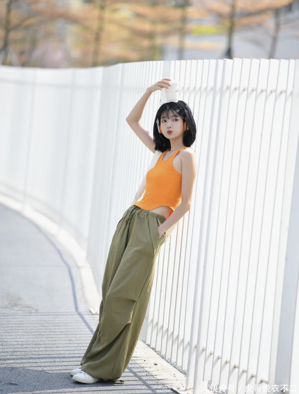 初夏季节,明亮的橙黄色可以给造型带来更多的生机与活力,橙黄色背心搭配军绿色运动风束腿裤,上窄下宽、上短下长的穿搭,就算是梨形身材也能轻松驾驭,这个初夏做个酷帅的女孩。