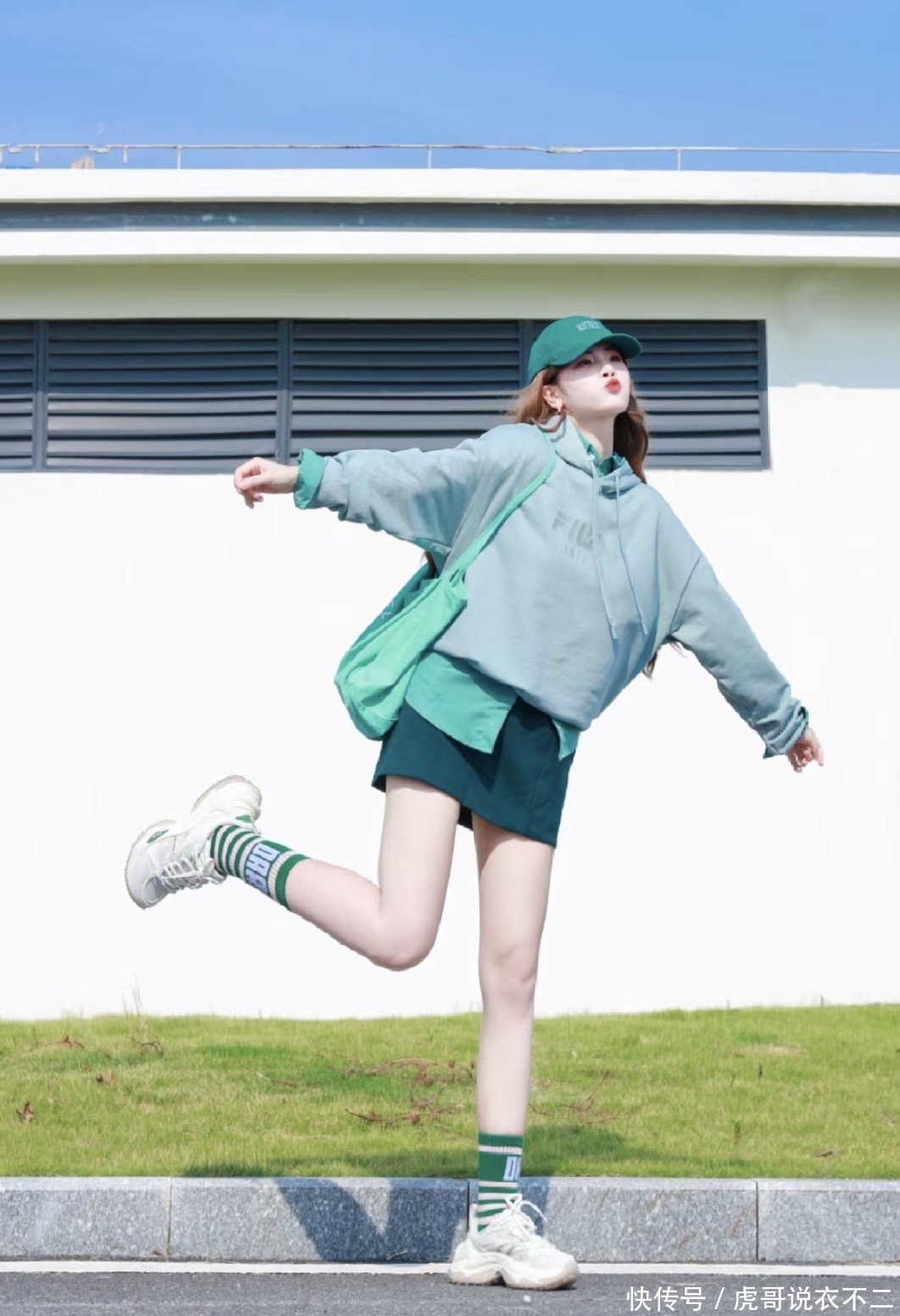 喜欢彩色搭配的更是不能错过运动混搭风,卫衣+衬衫叠穿,一步短裙配运动鞋,绿色系单品深浅不一的色彩递进,这才是初夏季节的正确打开方式。
