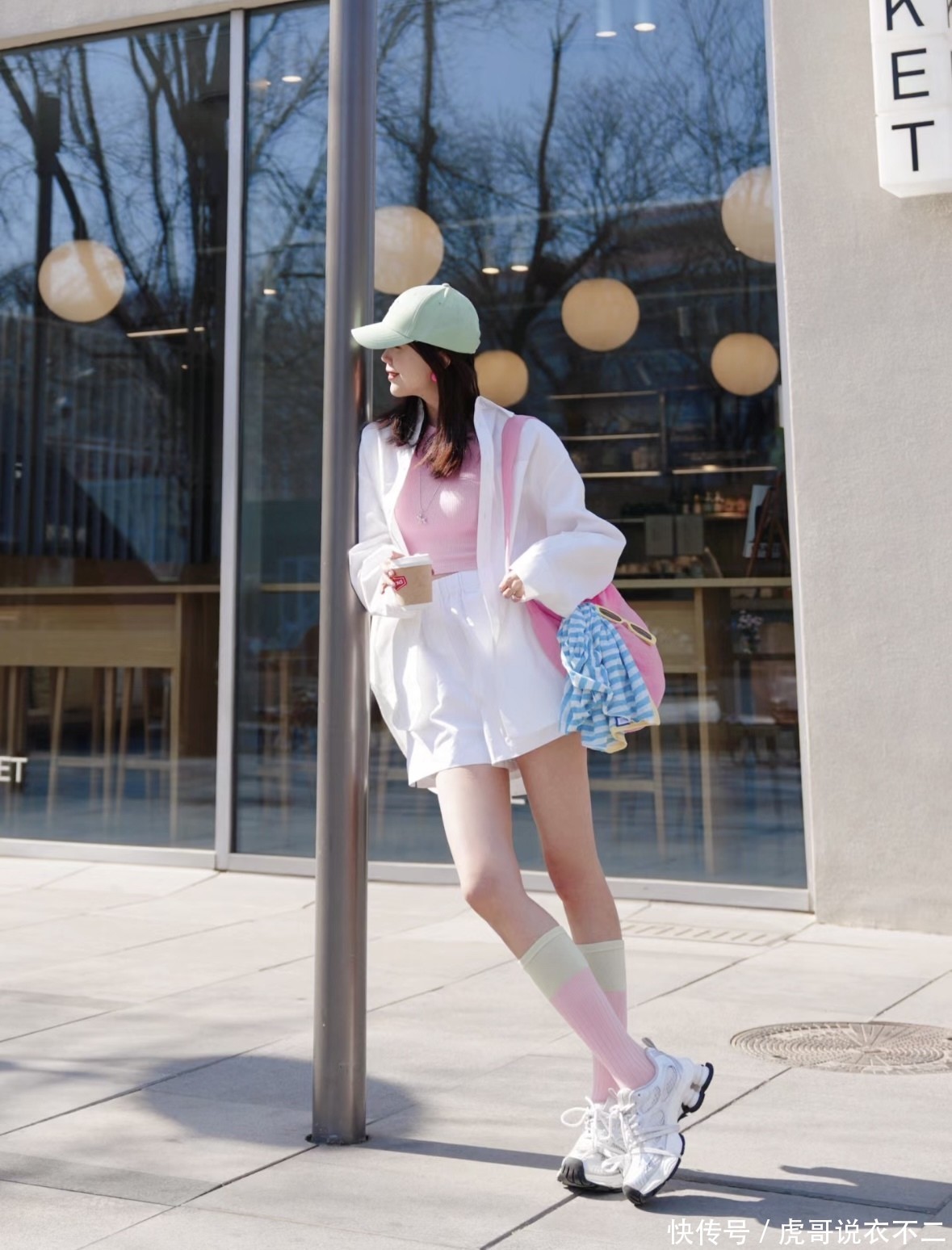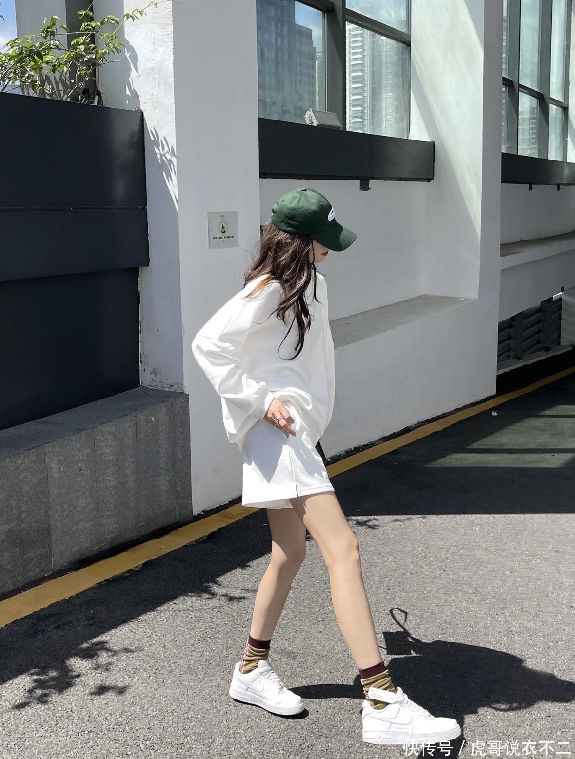 白色的卫衣+运动风短裤套装,鞋子选择纯白色运动板鞋,如果觉得整套造型太过单调,可以选择条纹袜+亮色棒球帽,给整个造型增加更多的活力感。