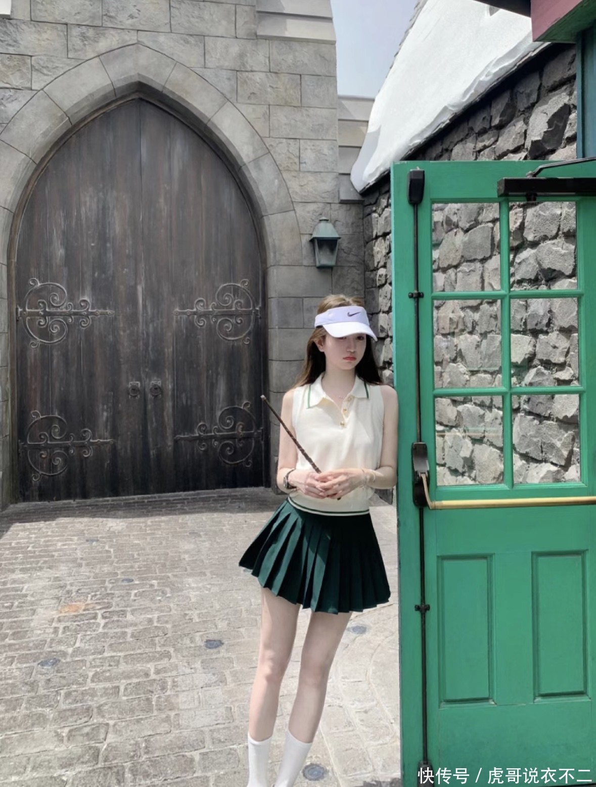 无袖POLO衫+百褶短裙,米色与绿色的碰撞,充满了生机与活力,仿佛在告诉你,夏天已经到来。