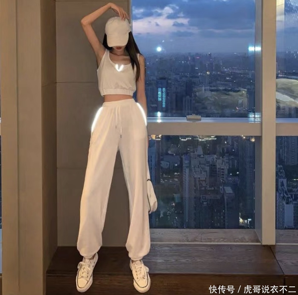 米白色露脐背心+同色系束腿运动裤+运动鞋,选择同色系棒球帽加持,整体造型可以轻松在运动与出街之间无缝衔接。