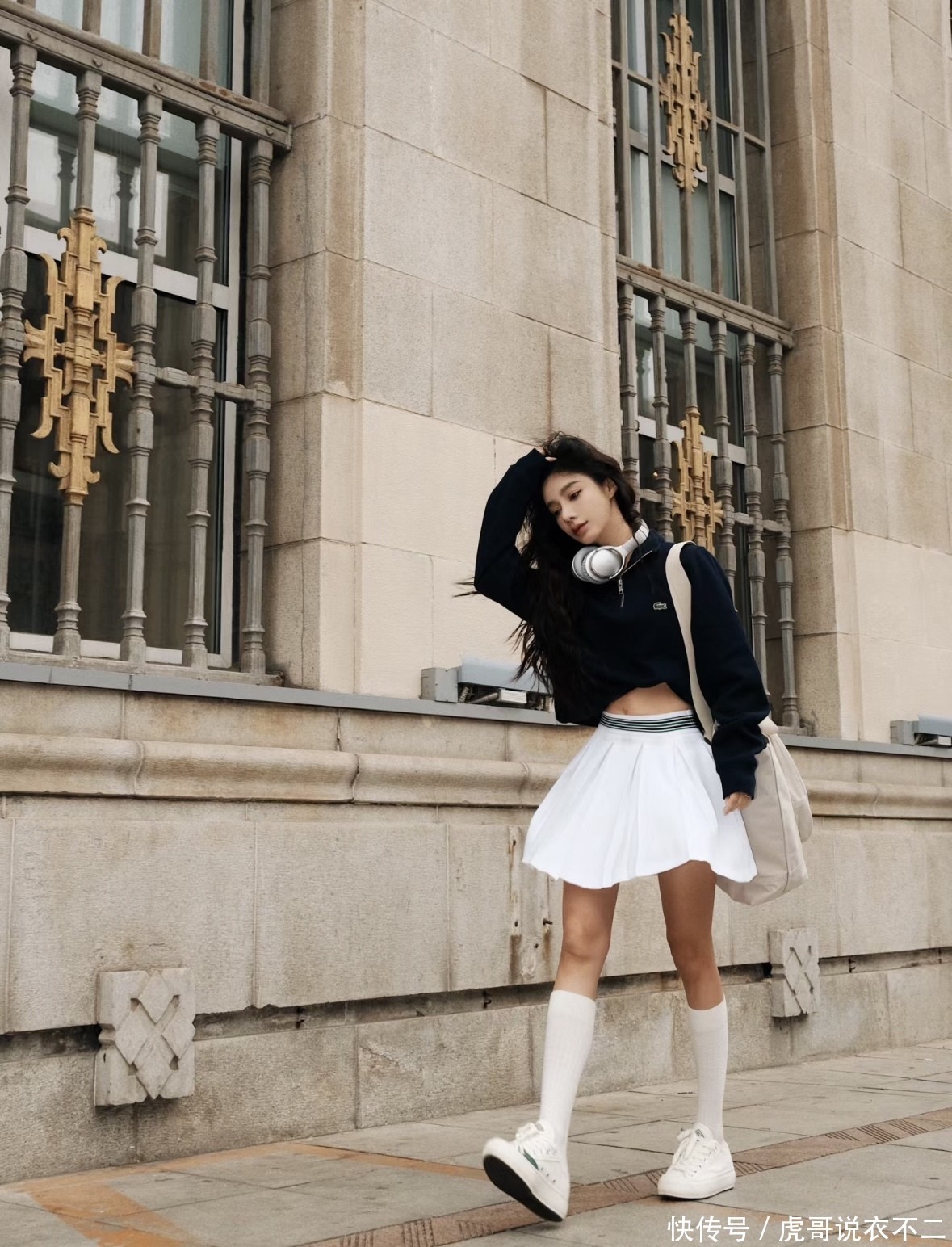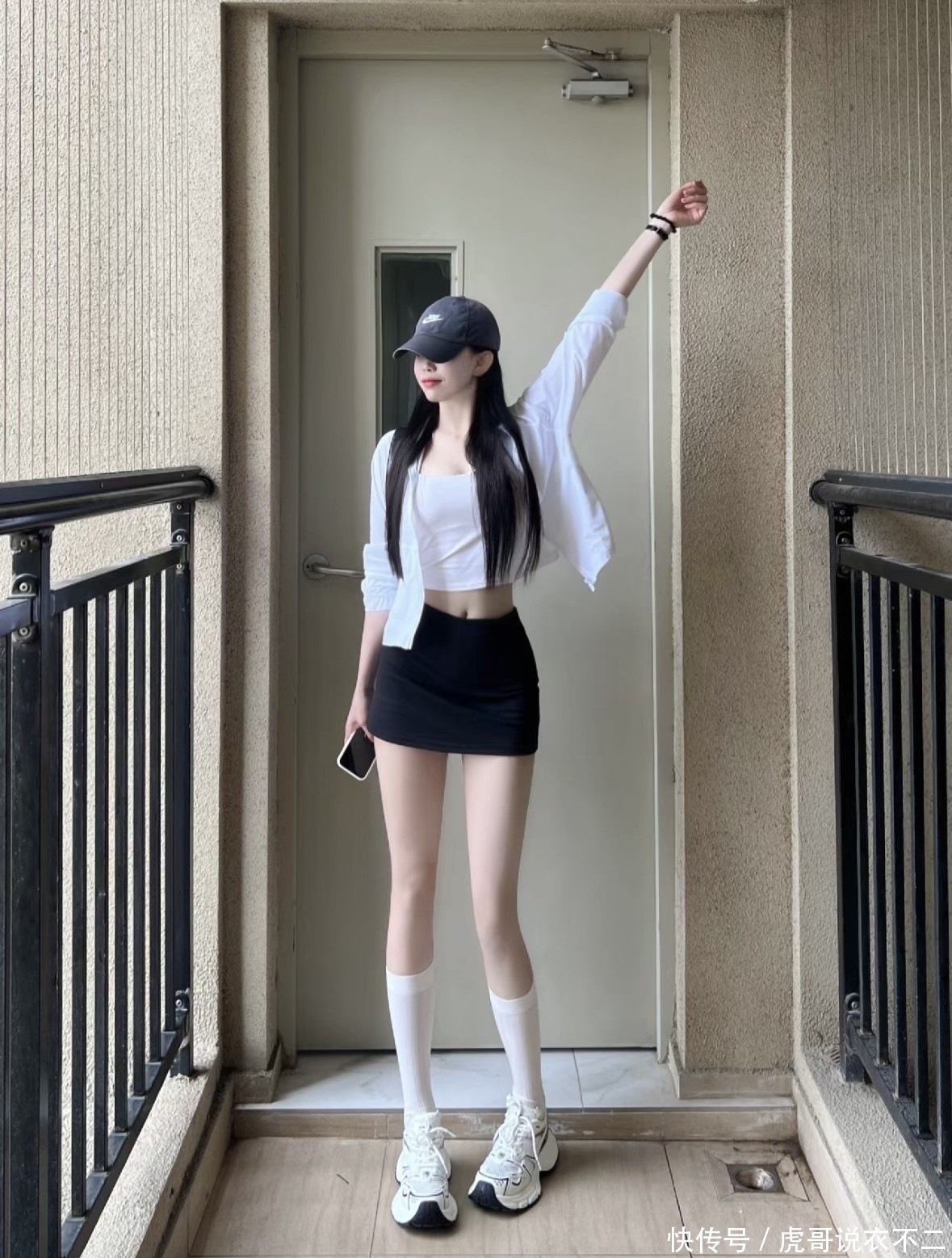 长筒袜必须要与短裙短裤搭配,才更能凸显腿长,黑色包臀短裙+白色长筒袜配运动鞋,上衣的运动风短卫衣+背心,非常简单的运动风混搭,时髦减龄又显身材。