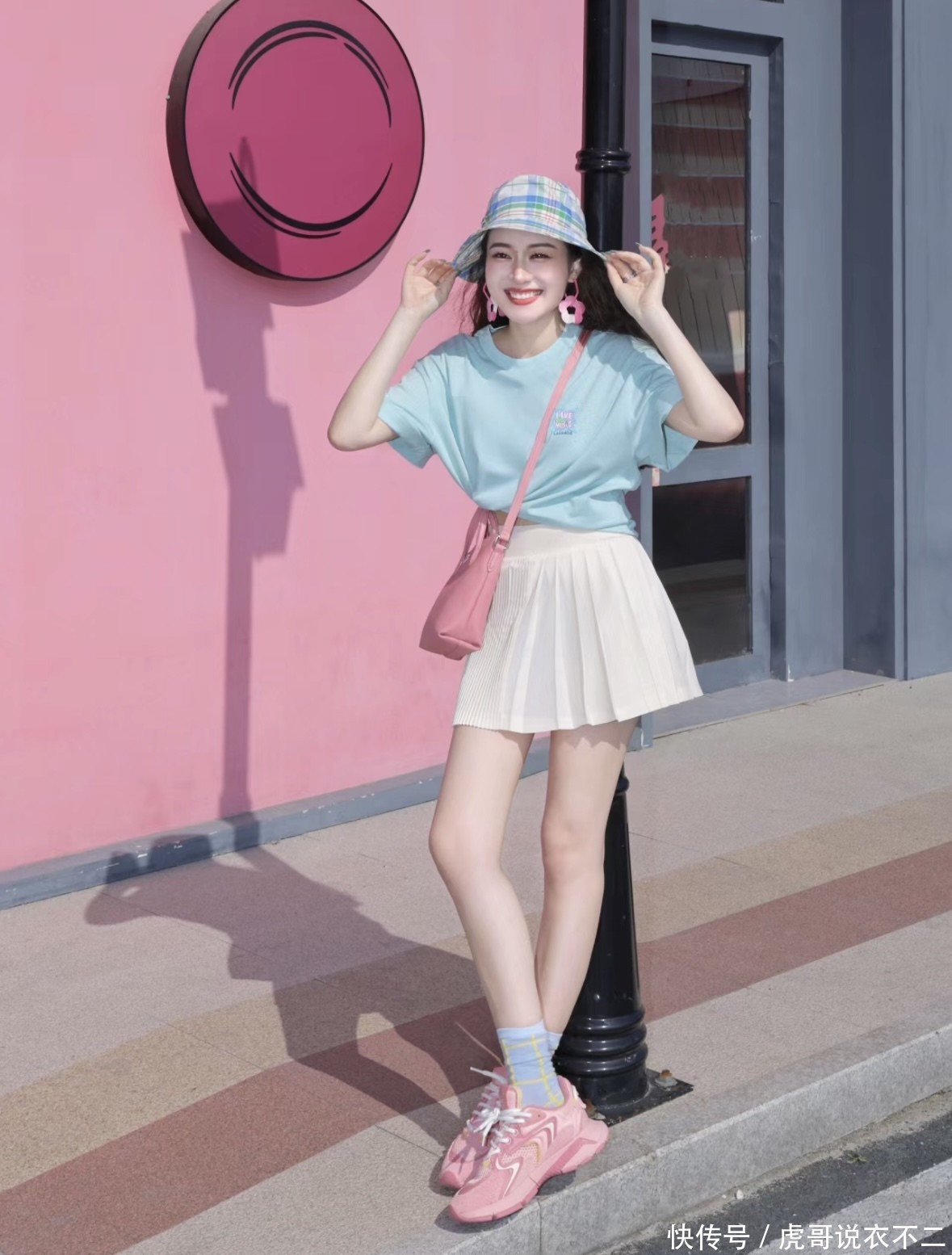 当浅绿色T恤遇见白色百褶裙,极具少女感的穿搭,粉色斜挎包和粉色运动鞋相呼应,这样的穿搭出行游玩绝对是一道靓丽的风景。