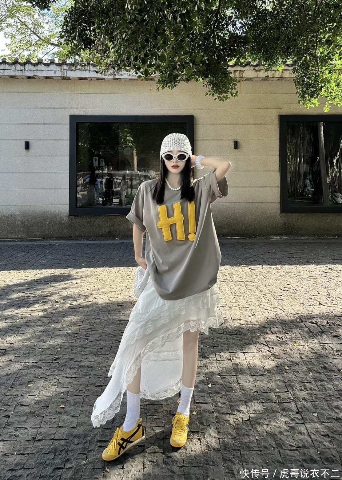 比如当运动风卫衣或者T恤遇上半身裙,诠释的是另一种温柔,灰色短袖T恤+白色不规则蕾丝半裙,将时髦与个性以及舒适感完美融合,走到哪里都是人群中焦点的存在。